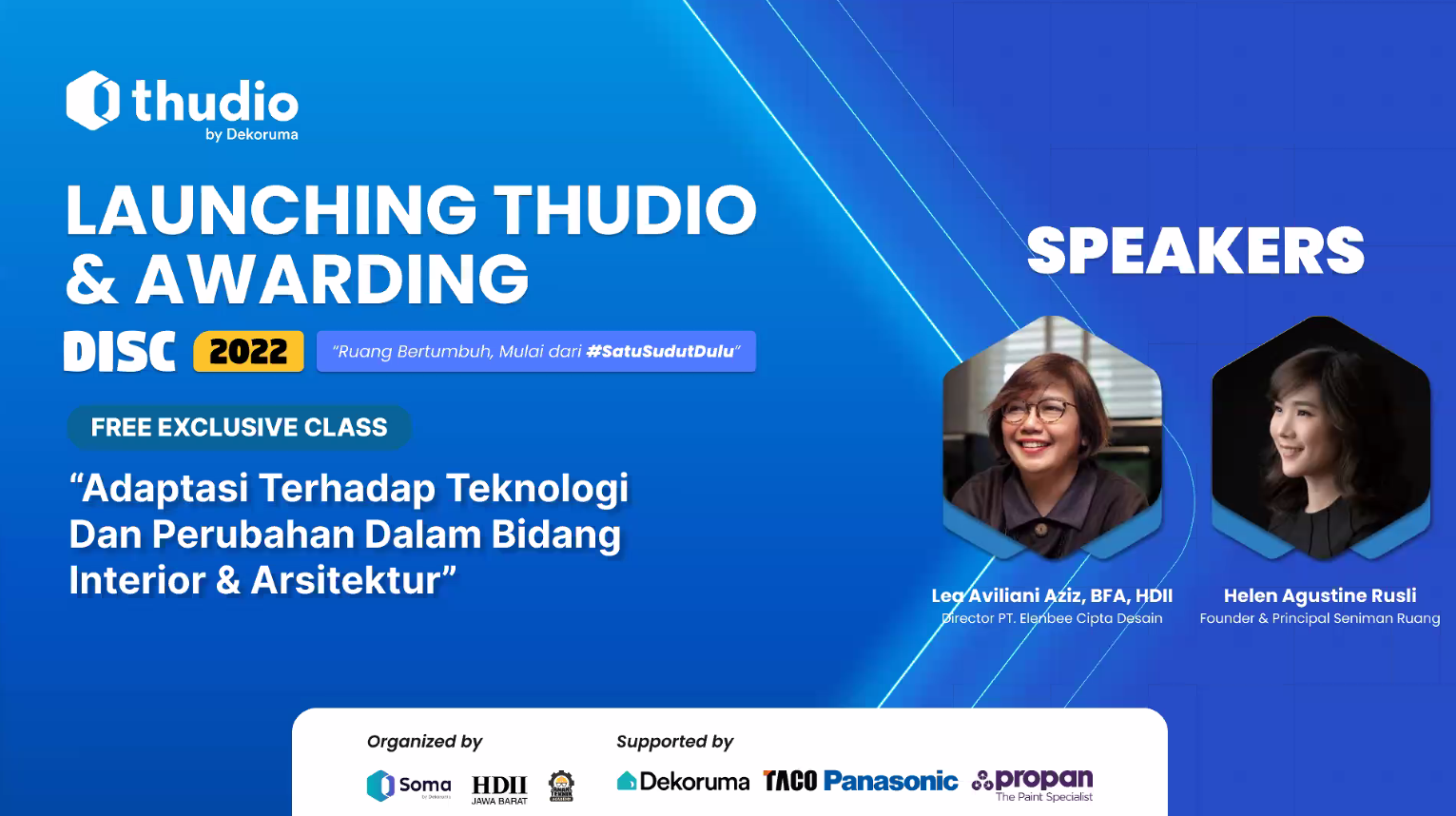 Dalam rangka peluncuran resmi Thudio, serangkaian acara telah diselenggarakan, termasuk acara peluncuran, webinar dan awarding dari kompetisi DISC 2022. Acara peluncuran diresmikan oleh Dimas Harry Priawan, CEO & Co-Founder Dekoruma. Sedangkan untuk acara webinar diisi dengan 2 narasumber, di antaranya Lea Aviliani Aziz, BFA, HDII (Director PT Elenbee Cipta Desain) yang memaparkan tentang Pengaruh Teknologi dengan Bidang Interior. Dilanjutkan dengan Helen Agustine Rusli (Founder & Principal Seniman Ruang) yang memaparkan tentang Design Practice: Adapting with Changes.