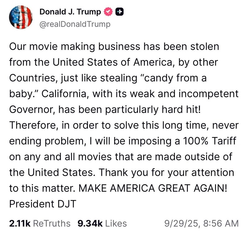 “Bisnis perfilman kita telah dicuri oleh negara lain, seperti mencuri permen dari bayi. Karena itu, saya akan memberlakukan tarif 100% pada semua film yang dibuat di luar Amerika Serikat. Terima kasih atas perhatian Anda,” tulis Trump.