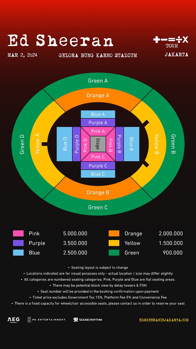 Tiket konser Ed Sheeran: +-=÷x Tour 2024 in Jakarta akan mulai tersedia untuk dibeli melalui edsheeraninjakarta.com dengan rincian harga mulai dari harga Rp. 900.000, – sampai harga Rp. 5.000.000, –