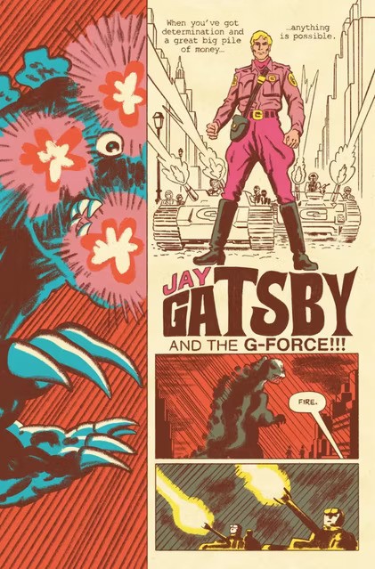 Cerita ini berlatar tahun 1922, ketika salah satu pesta Jay Gatsby yang terkenal berisik secara tidak sengaja memanggil Godzilla, yang menghancurkan rumah mewah milik Gatsby di West Egg. Untuk membalas dendam, Gatsby bekerja sama dengan berbagai ikon sastra lainnya untuk mengalahkan binatang buas tersebut. Kata Scioli, “Bayangkan jika Godzilla masuk ke dalam novel besar Amerika. Ini adalah kisah epik. Ini adalah petualangan besar yang menjelajahi dunia, namun juga merupakan kisah cinta dan kesedihan yang mendalam.” Scioli berjanji. Cover pertama dari seri ini, yang merupakan penghormatan kepada cover ikonik Jack Kirby dari Fantastic Four #1, menampilkan Godzilla yang muncul dari bumi untuk menghadapi Holmes, Gatsby, penjelajah waktu H.G. Wells dari The Time Machine, dan sosok misterius berjubah dan bercakar yang mungkin saja adalah Dracula. Sebuah sampul alternatif untuk menghormati lukisan terkenal Francis Cugat tentang seorang wanita tanpa tubuh yang menghiasi sampul edisi pertama The Great Gatsby – dengan Godzilla yang menyeringai, tentu saja, menggantikan wanita tersebut. Seri ini akan terdiri dari tiga edisi empat puluh halaman; tanggal rilisnya belum diumumkan.