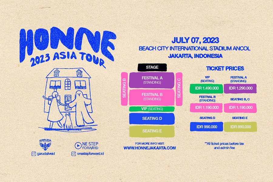 tiket.com, Online Travel Agent (OTA) pertama di Indonesia, secara resmi menjadi mitra penjualan tiket dalam konser HONNE ASIA TOUR 2023 yang dipromotori oleh Garuda Entertainment dan One Step Forward. Konser yang akan diselenggarakan pada 7 Juli 2023 di Beach City International Stadium, Ancol ini akan menjadi pengobat rindu fans untuk bersenandung bersama HONNE. Sebagai mitra penjualan tiket resmi, tiket konser HONNE ASIA TOUR 2023 nantinya dapat dibeli melalui aplikasi atau bisa langsung klik tautan ini untuk membeli tiketnya.