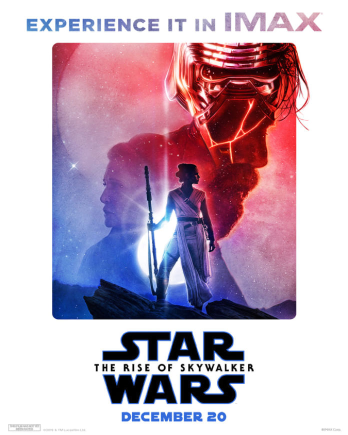 Dalam poster lain untuk versi IMAX, aroma pertempuran yang sedang berlangsung antara Sisi Terang dan Gelap yang diwariskan dari generasi ke generasi dibuat jelas dengan Rey berdiri di bawah kepala besar Kylo Ren serta Leia (Carrie Fisher) dan Luke (Mark Hamill) ) mengambang di atasnya. Kedua poster itu menakjubkan untuk dilihat dan membantu memberi rasa apa yang menanti Anda saat menonton Rise of Skywalker.