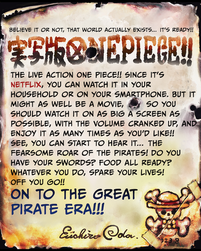 Netflix bersama dengan Shueisha membagikan surat dari Eiichiro Oda, kreator serial manga ONE PIECE yang paling legendaris dan tenar sepanjang sejarah. Surat ini ditujukan kepada para penggemar untuk memberi kabar tentang versi live action ONE PIECE yang amat dinanti-nantikan. “Cari layar yang sebesar mungkin, kencangkan volumenya, dan tonton berapa kali pun yang kalian mau!!”.