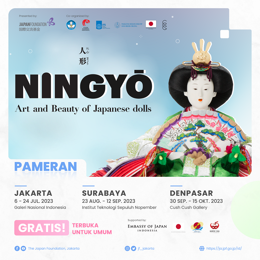 The Japan Foundation, Jakarta akan menyelenggarakan pameran “NINGYŌ: Art and Beauty of Japanese dolls” di tiga kota: Jakarta, Surabaya, dan Denpasar mulai dari bulan Juli hingga Oktober 2023. Pameran ini menghadirkan 67 karya boneka tradisional dan modern, disertai penjelasan sejarah, fungsi, dan penyebarannya dalam kebudayaan mayarakat Jepang.