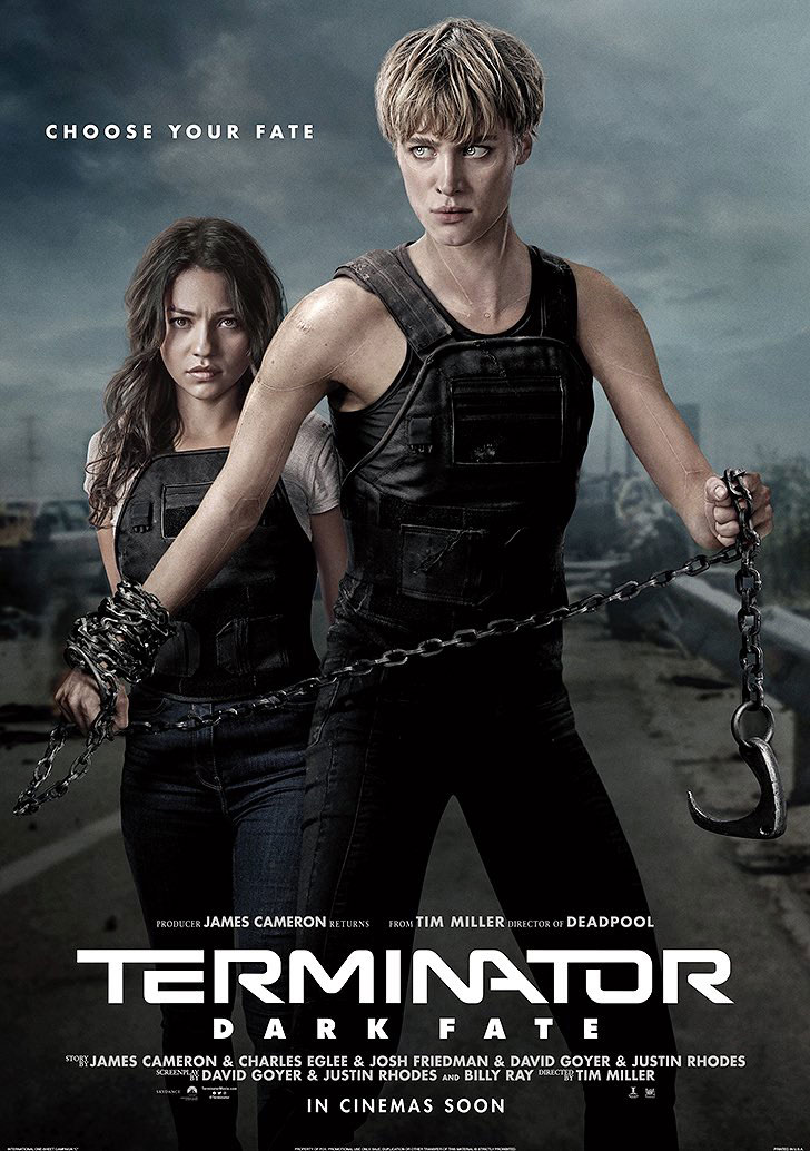 Paramount Pictures telah menghadirkan secara online empat poster Terminator: Dark Fate terbaru. Keempatnya menyertakan tagline “Choose Your Fate.” Yang pertama hanya menampilkan sosok Terminator “lama” yang diperankan oleh Arnold Schwarzenegger dan yang kedua menampilkan dua sosok karakter baru dengan memperlihatkan karakter Natalia Reyes dan Mackenzie Davis.
