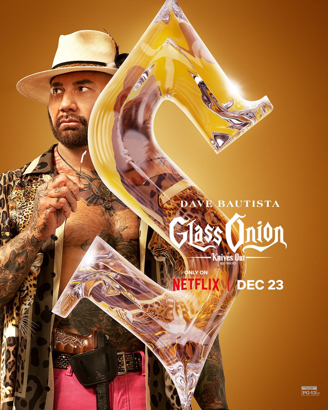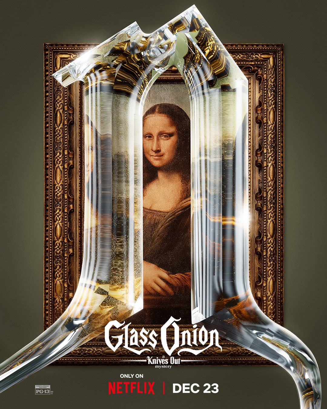 Bersama dengan Craig, pemeran baru, yang mendapatkan poster karakter mereka sendiri yang penuh warna adalah Kate Hudson, Leslie Odom Jr., Dave Bautista, Janelle Monae, Edward Norton, Jessica Henwick, Kathryn Hahn, dan Madelyn Cline. Bahkan Mona Lisa juga mendapat poster karakternya sendiri, yang menunjukkan karya seni tersebut memainkan peran kunci dalam plot film ini. Uniknya, setiap karakter berpose dengan huruf timbul yang mewakili salah satu huruf dari Glass Onion yang dihamparkan pada gambar poster.