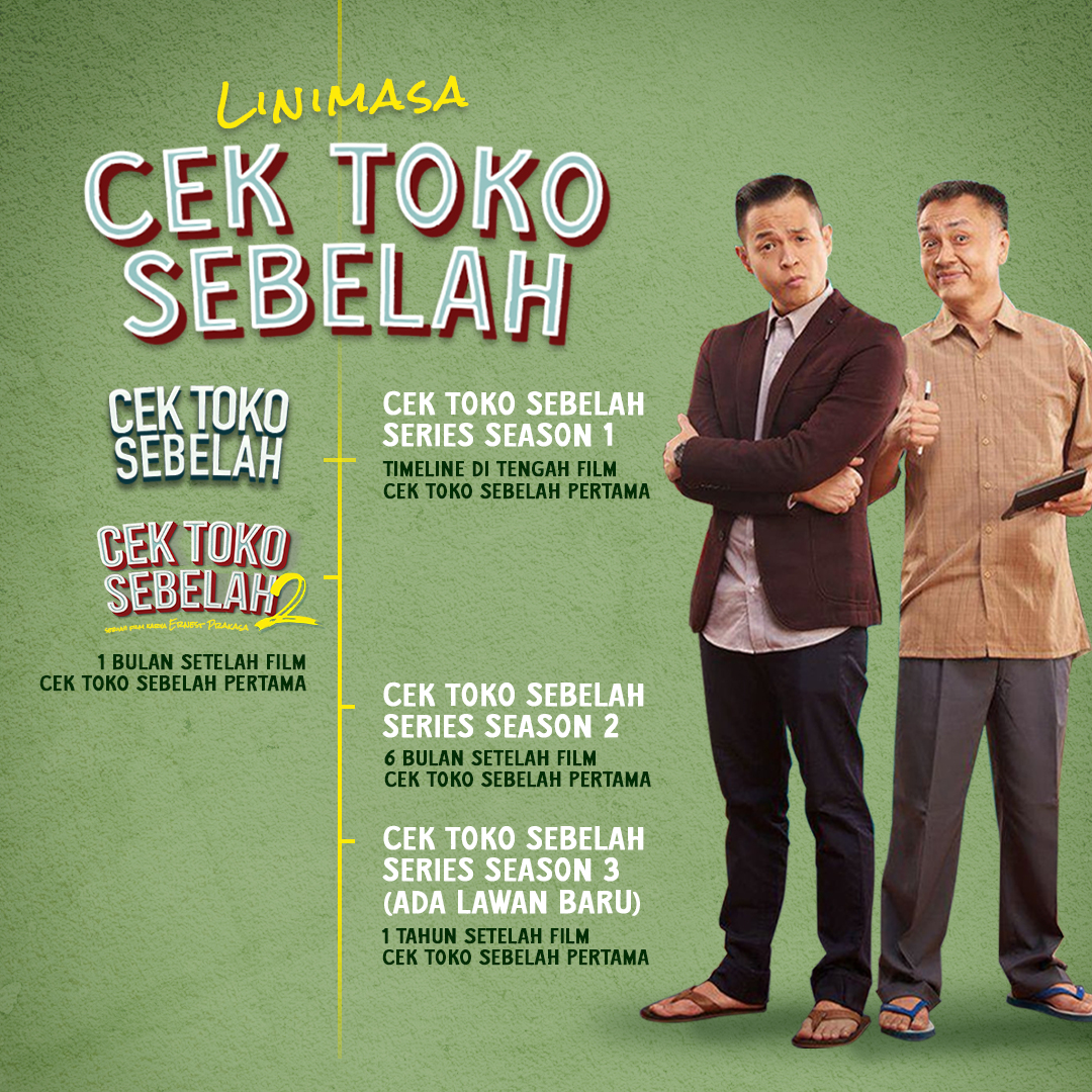 Jika diurutkan secara timeline, cerita keluarga Koh Afuk ini dimulai dengan film CEK TOKO SEBELAH yang pertama. Lalu satu bulan kemudian, ceritanya dilanjutkan dengan CEK TOKO SEBELAH 2. Sementara untuk series, season pertama terjadi di dalam film CEK TOKO SEBELAH yang pertama, season kedua terjadi enam bulan setelah film pertama, dan season 3 (ADA LAWAN BARU) yang juga akan segera tayang, terjadi satu tahun setelah film pertama.