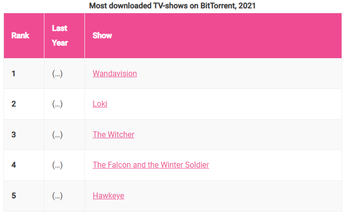 Selama beberapa tahun terakhir, Torrent Freak (TF) telah menganalisis jumlah acara televisi dan film yang paling banyak dibajak pada akhir setiap tahun untuk menentukan mana yang telah diunduh secara ilegal lebih banyak daripada yang lain. Setelah sekian lama “gelar” untuk serial televisi dipegang oleh Game of Thrones, tahun lalu “gelar” tersebut memiliki juara baru yaitu serial The Mandalorian. Dan tahun ini, serial milik Disney+ lainnya mengambil alih “kehormatan” tersebut dengan WandaVision menduduki puncak daftar 2021.